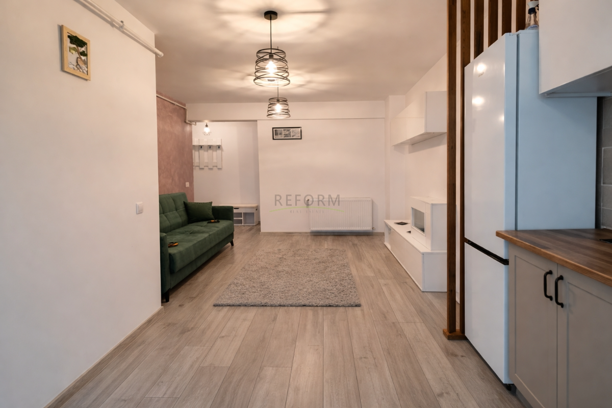 Compartimentarea acestuia este: 1 hol la intrare, 1 living cu bucătărie open-space, 1 dormitor matrimonial complet mobilat, 1 baie moderna și balcon de 1.70 mp