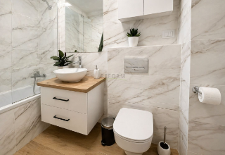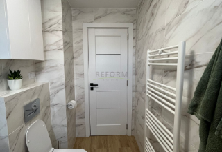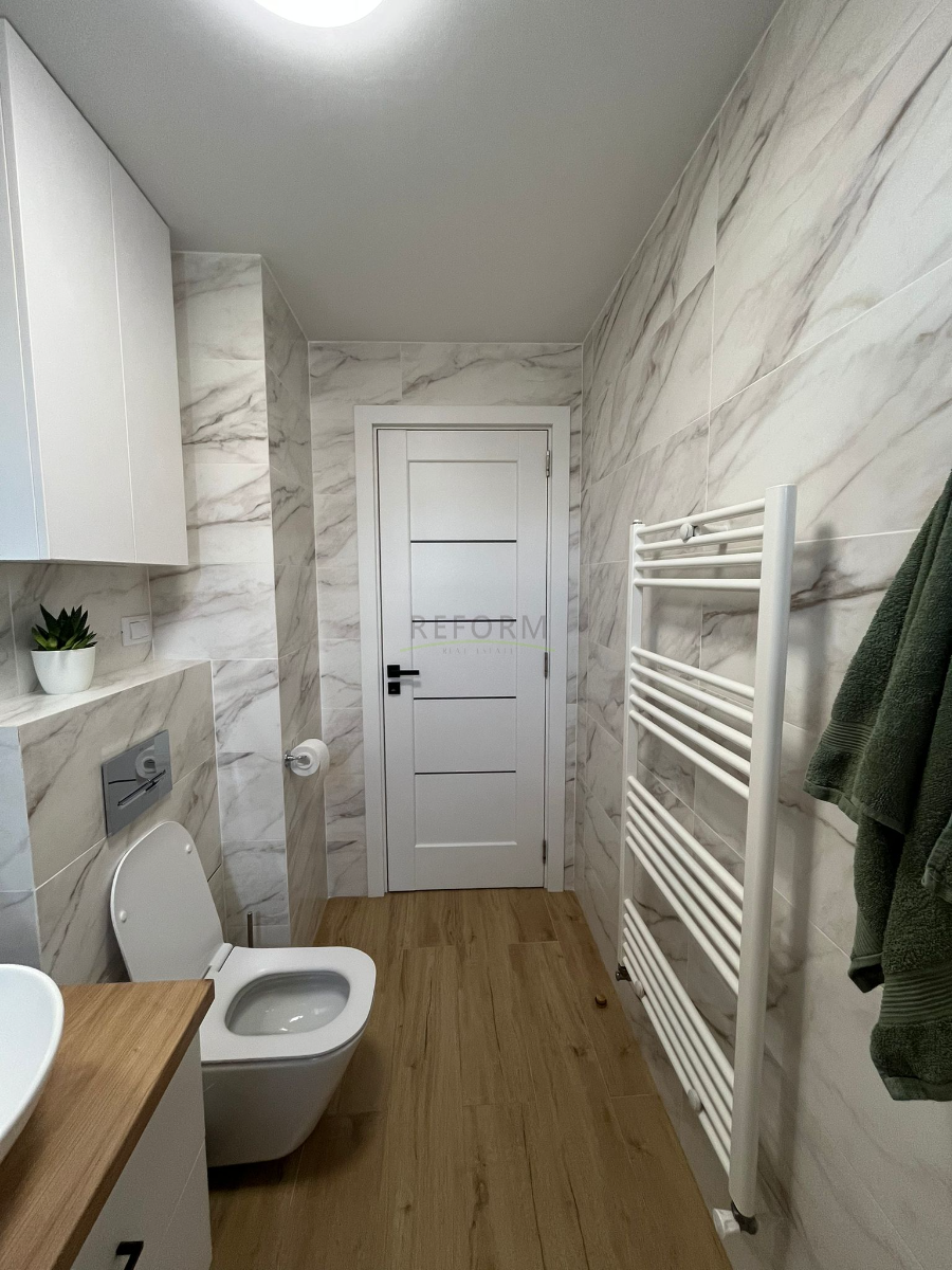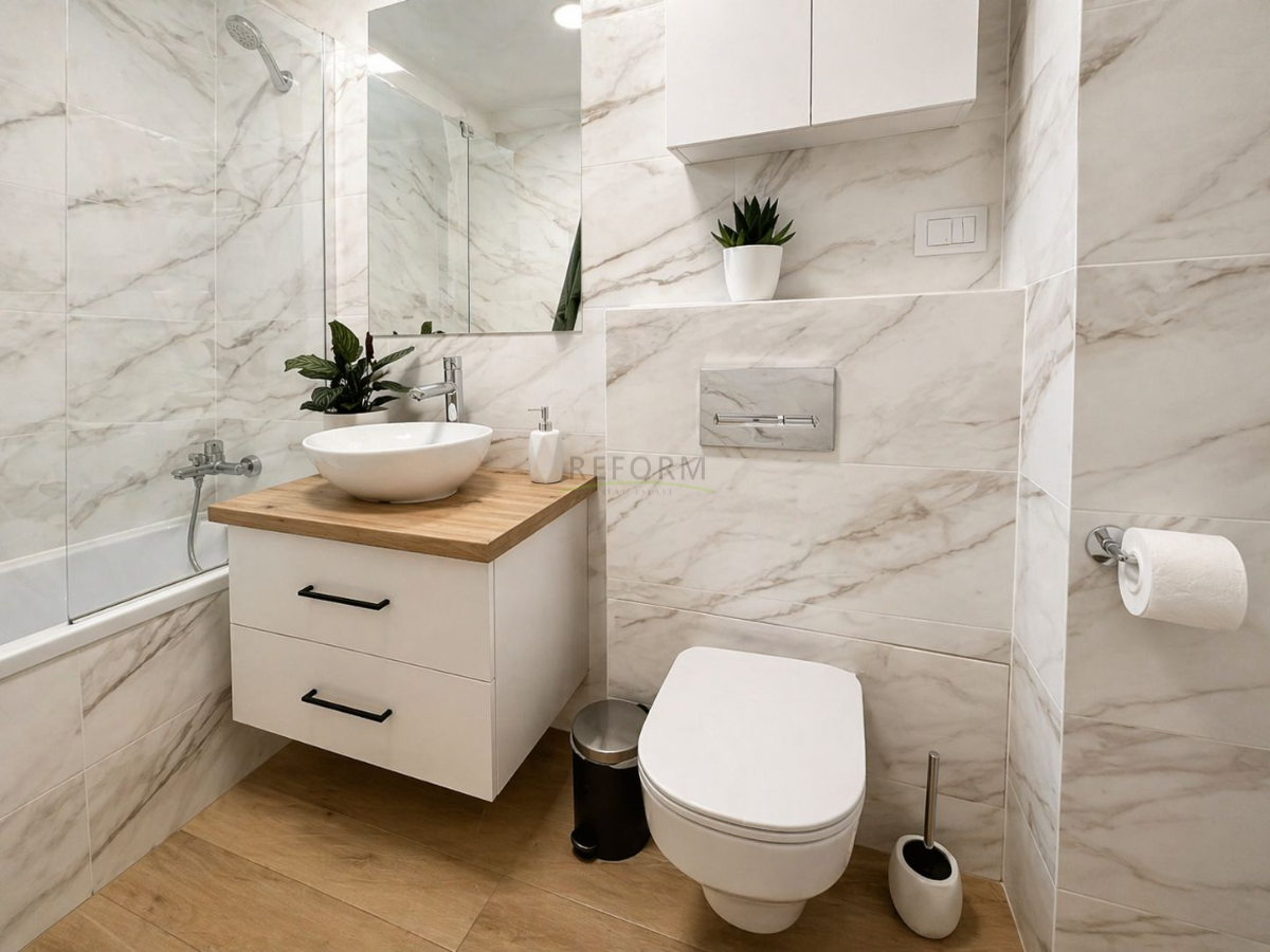 Baia este prevăzută cu cadă și duș și are spațiu suficient de depozitare (2 dulapuri).
