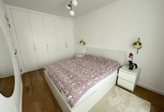 Dormitorul este gândit practic, cu dressing pe tot peretele, astfel încât totul are locul lui și spațiul rămâne aerisit.