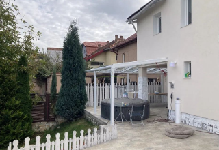 În spatele casei se află o terasă de 80 m², din care 35 m² sunt acoperiți cu pergolă din structură metalică și sticlă securizată.