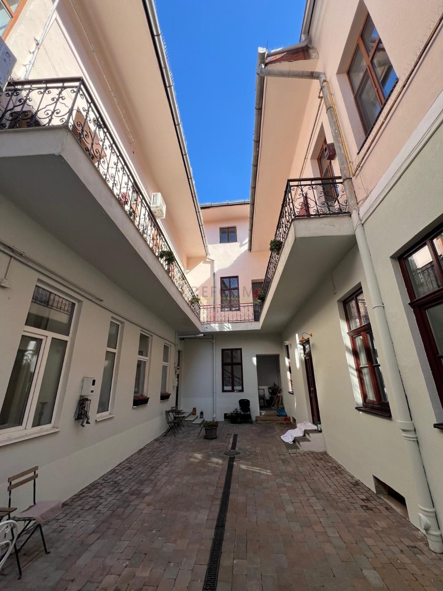 Înălțimea tavanului este de 3m, iar geamurile sunt orientate către curte.