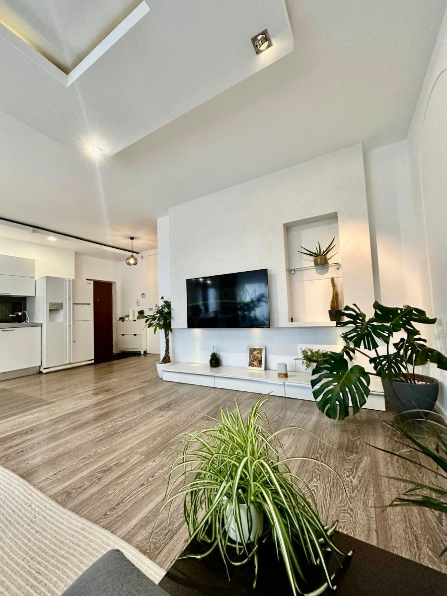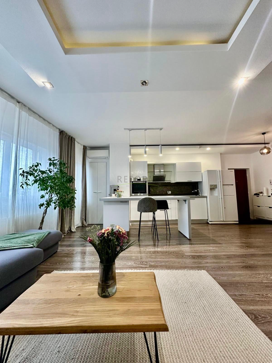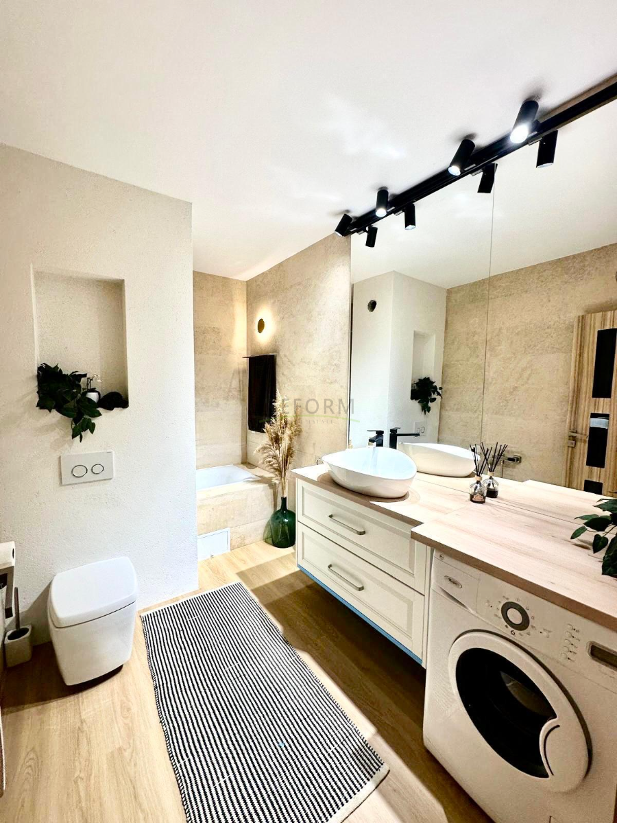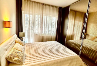 Apartamentul deține finisaje moderne de calitate superioară, baie cu piatră naturală, centrală termică, aer condiționat, 3 dressinguri plus un garaj subteran cu cf separat.
