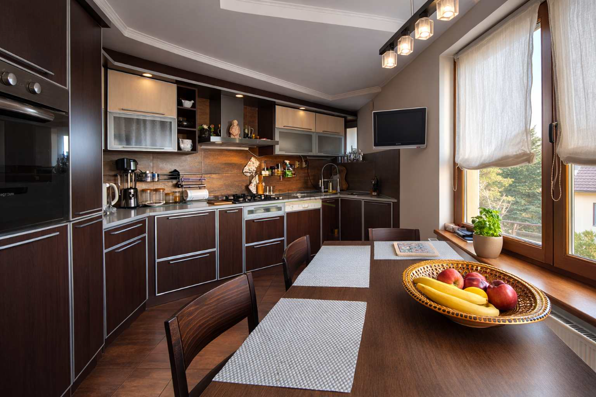 Bucătăria și diningul sunt generoase, perfect integrate, cu acces direct pe terasă și în grădina din spatele casei – un cadru ideal pentru relaxare sau seri petrecute cu familia și prietenii.