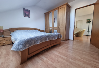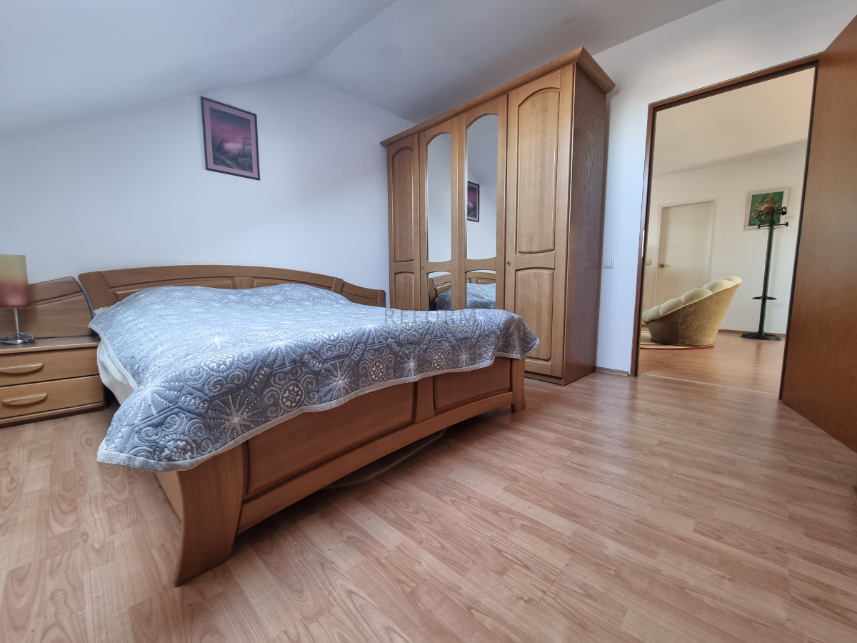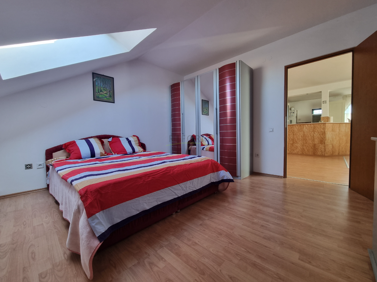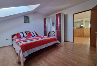 Az alsó szinten 2 hálószoba, egy tágas nappali konyhával és ebédlővel, egy nagy méretű fürdőszoba és egy szép kilátással rendelkező erkély található. A tetőtérben két szoba kapott helyet.