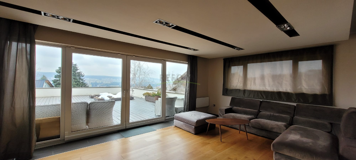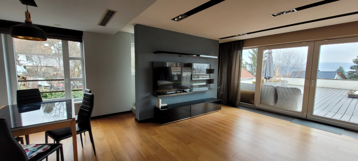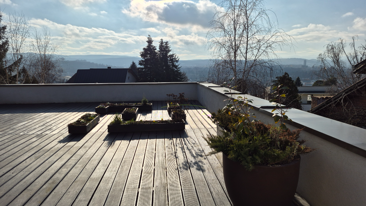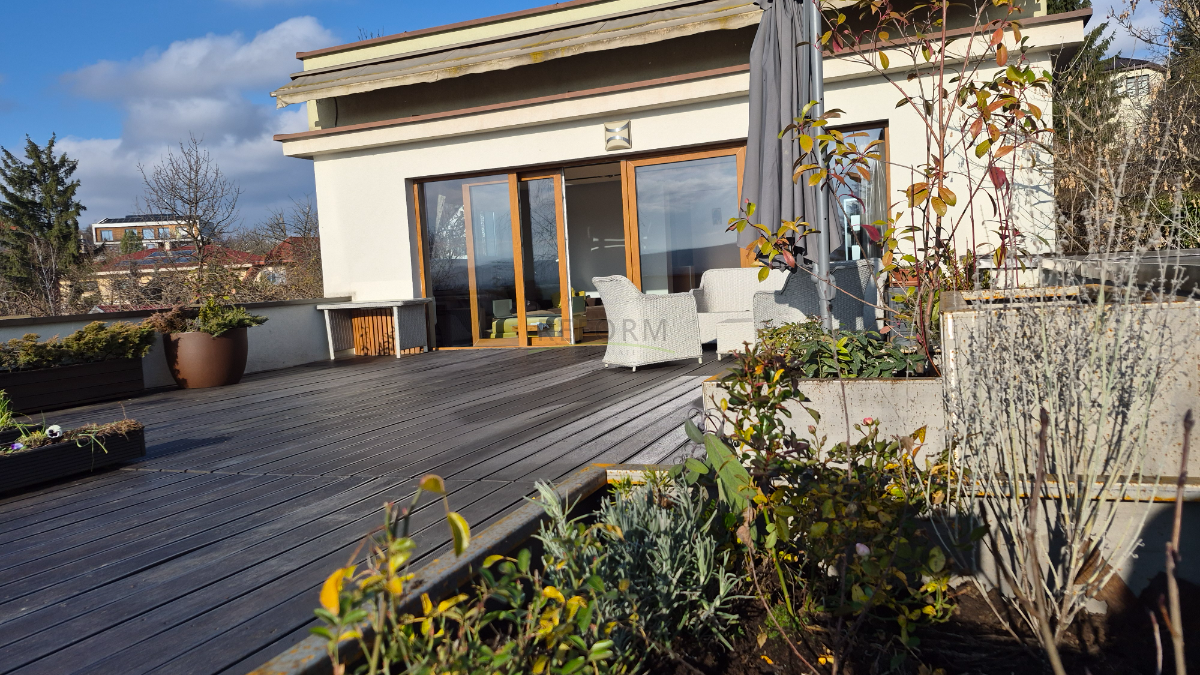 135 nm hasznos területű, kis kerttel (35 nm) és város fele néző, déli fekvésű 80 nm-es terasszal, ritkaszép kilátással a város felé.